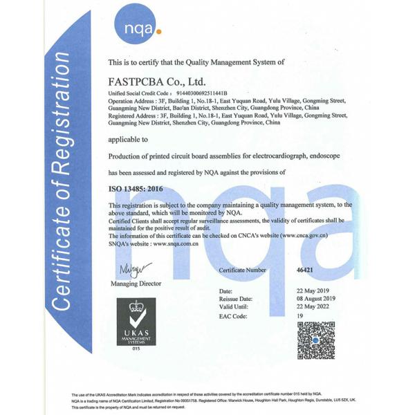 Scope of quality management system certification: Production of PCB components for electrocardiograph and endoscope.Through IS013485: 2016 certification, it not only proves that under the quality assurance system, FASTPCBA can continuously provide high-quality products that meet the needs of medical device customers, and further demonstrates our company's higher requirements for product quality standards. The successful passing of this IS013485: 2016 certification is an endorsement of FASTPCBA product quality and safety regulations aspects.